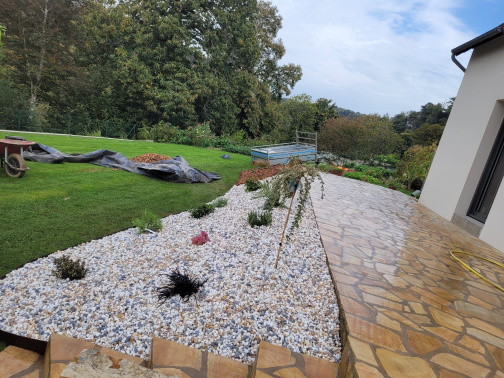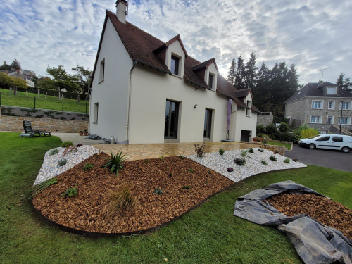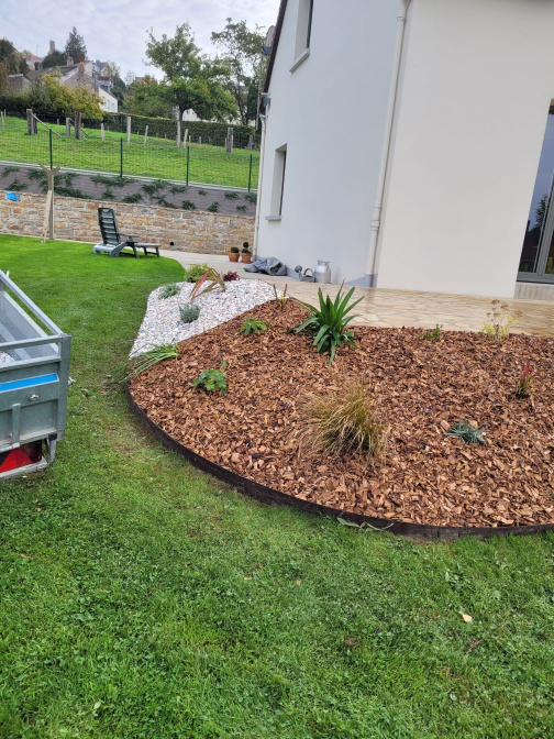 Création de massifs avec copeaux de bois, galets et végétaux