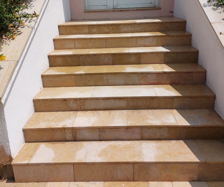 Il s'agit de l’entretien d’un escalier d’accès à une entrée de maison. Avec le temps, les marches s’étaient encrassées sous l’effet des intempéries et des passages répétés. L’intervention a permis de raviver l’ensemble et de redonner une belle uniformité à l’entrée, tout en améliorant la sécurité et l’esthétique du lieu.